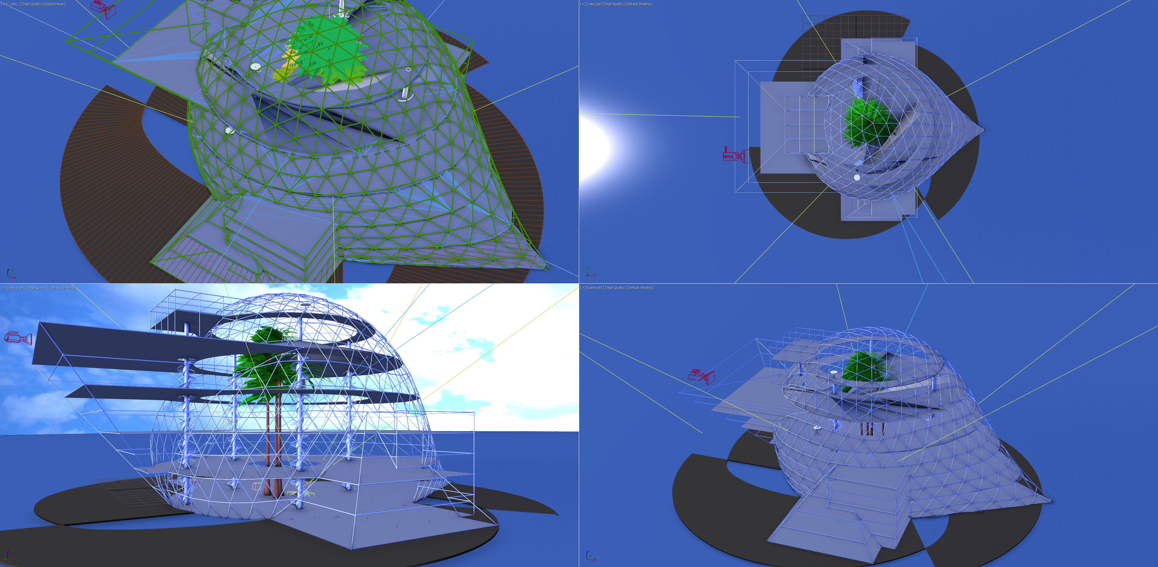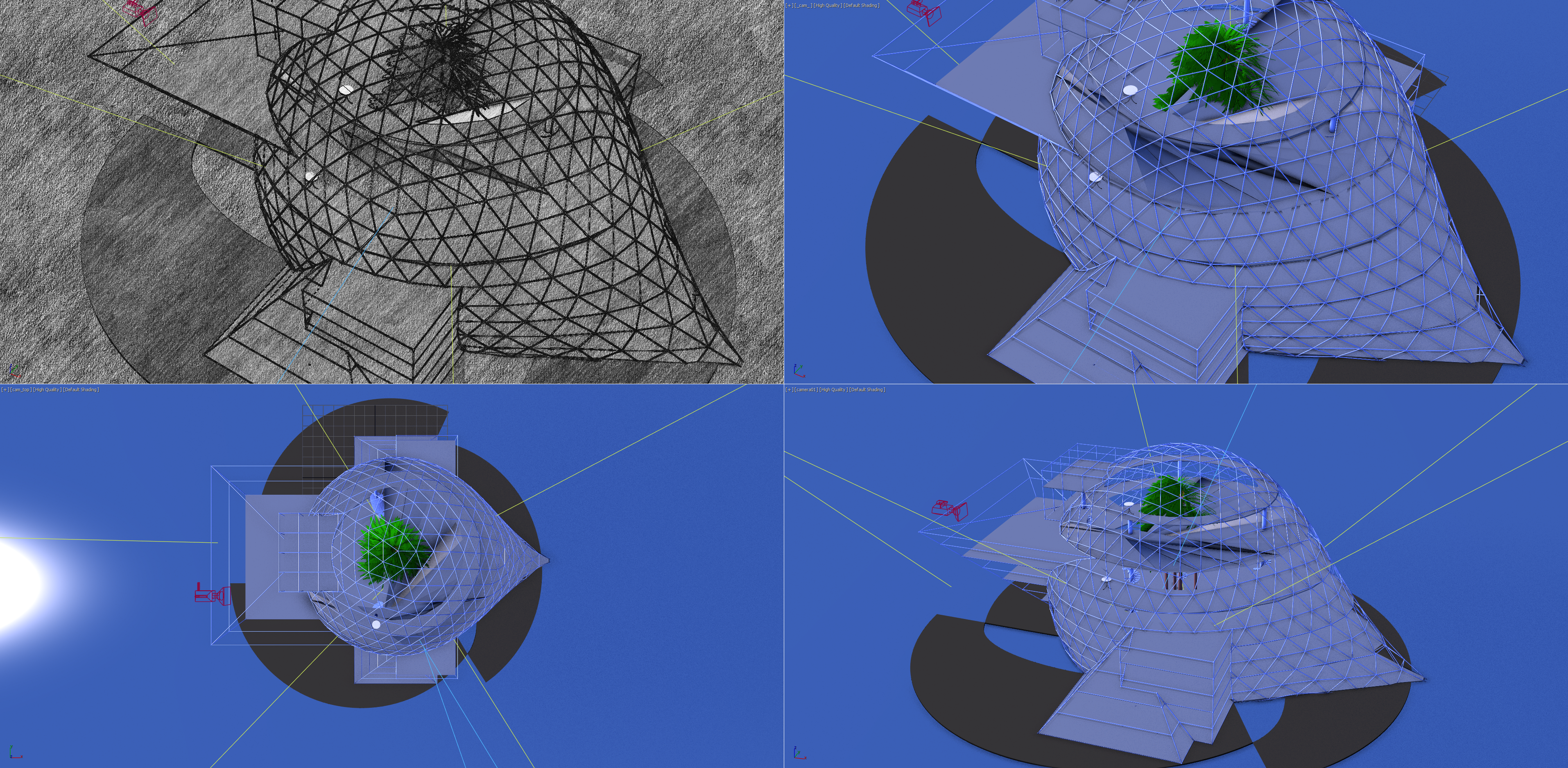 Wireframe metroverse scene on quad viewports