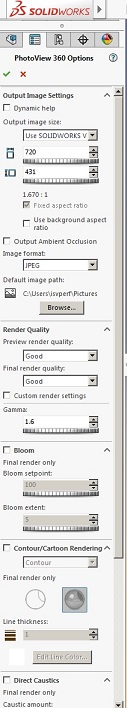 - Make sure that your settings match the defaults shown below. As long as the pull down below Output image size reports “Use Solidworks View”, it is possible that the size reported below varies since it depends on the display resolution.