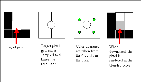 With super-sampling, the image is up-scaled by a sample factor. The pixels around the target pixel are sampled, and then as the image is downsized back to the original. The target pixel’s color is modified as necessary with respect to the colors of the sampled pixels in order to make the edge look less jagged. Figure 3 is an example of how anti-aliasing is accomplished using super-sampling with four samples.