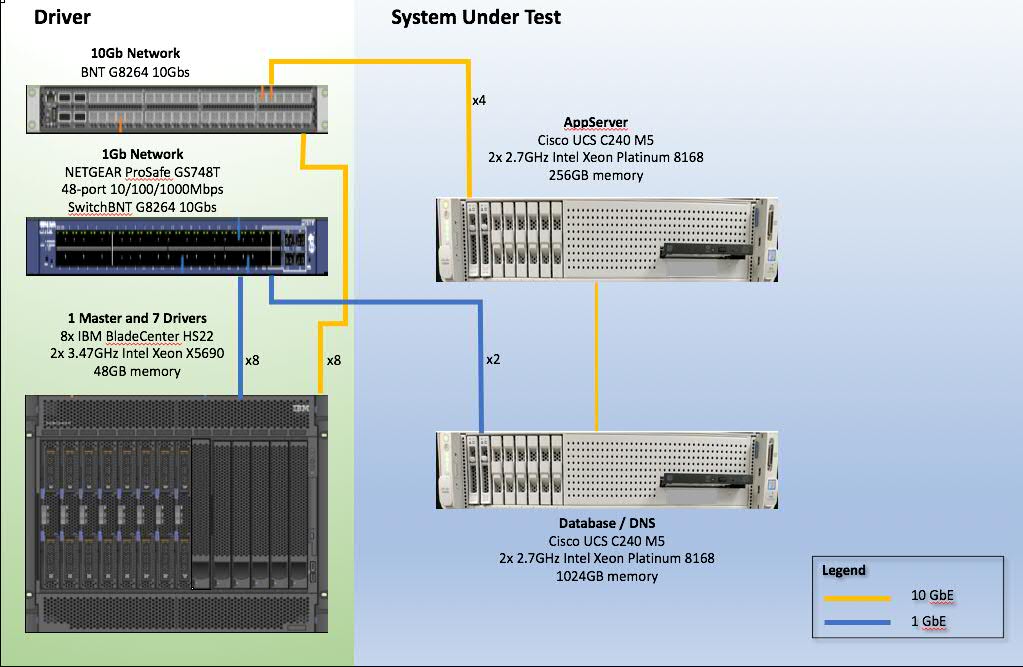 ----------------------------Application Server SUT---------------------------- Supplier Description Product # Qty -------- ------------------------------------------- ---------------- --- Cisco UCS C240 M5 8 SFF UCSC-C240-M5S 1 + 2 rear drives w/o CPU,mem,HD,PCIe,PS Cisco 32GB DDR4-2666-MHz RDIMM/PC4-21300/ UCS-MR-X32G2RS-H 8 dual rank/x4/1.2v Cisco Riser 1 incl 3 PCIe slots (x8, x16, x8); UCSC-PCI-1-C240M5 1 slot 3 req CPU2 Cisco Riser 2A incl 3 PCIe slots (x8, x16, x16) UCSC-PCI-2A-240M5 1 supports GPU Cisco Media Drive (DVD) for C240 M5 Servers UCSC-DVD-C240M5 1 (8 HDD version only) Cisco UCS 1050W AC Power Supply for Rack Server UCSC-PSU1-1050W 2 Cisco Power Cord Jumper, C13-C14 Connectors CAB-C13-C14-2M 2 Cisco Ball Bearing Rail Kit for C220 & C240 UCSC-RAILB-M4 1 M4 & M5 rack servers Cisco IMC SW (Recommended) latest release CIMC-LATEST 1 for C-Series Servers Cisco UCS C-Series M5 SFF drive blanking panel UCSC-BBLKD-S2 8 Cisco Cisco ONE Data Center Compute Opt Out Option C1UCS-OPT-OUT 1 Cisco 2.7 GHz 8168/205W 24C/33MB Cache/DDR4 2666MHz UCS-CPU-8168 2 Cisco Intel X710-DA2 dual-port 10G SFP+ NIC UCSC-PCIE-ID10GF 2 Cisco Intel X710 quad-port 10G SFP+ NIC UCSC-PCIE-IQ10GF 2 Cisco Heat sink for UCS C240 M5 rack servers UCSC-HS2-C240M5 2 CPUs above 150W... Cisco Super Cap cable for UCSC-RAID-M5 CBL-SC-MR12GM52 1 on C240 M5 Servers Cisco 12G Modular RAID controller with 2GB cache UCSC-RAID-M5 1 Cisco 480 GB 2.5 inch Enterprise Value 6G SATA SSD UCS-SD480G61X-EV 2 Cisco Super Cap for UCSC-RAID-M5, UCSC-MRAID1GB-KIT UCSC-SCAP-M5 1 Cisco 10GBASE-SR SFP Module SFP-10G-SR= 12 Cisco SUSE Linux Enterprise Server w/ 3yr support SLES-2S-HA-3 1 Cisco SNTC 24X7X4 UCS C240 M5 8 SFF CON-SNTP-CC240M5S 1 + 2 rear drives w/o CPU,mem,HD ------------------------------------DB SUT------------------------------------ Supplier Description Product # Qty -------- ------------------------------------------- ---------------- --- Cisco UCS C240 M5 8 SFF UCSC-C240-M5S 1 + 2 rear drives w/o CPU,mem,HD,PCIe,PS Cisco 2.7 GHz 8168/205W 24C/33MB Cache/DDR4 2666MHz UCS-CPU-8168 2 Cisco 64GB DDR4-2666-MHz LRDIMM/PC4-21300/ UCS-ML-X64G4RS-H 16 quad rank/x4/1.2v Cisco Riser 1 incl 3 PCIe slots (x8, x16, x8); UCSC-PCI-1-C240M5 1 slot 3 req CPU2 Cisco Riser 2A incl 3 PCIe slots (x8, x16, x16) UCSC-PCI-2A-240M5 1 supports GPU Cisco Intel X520 Dual Port 10Gb SFP+ Adapter N2XX-AIPCI01 2 Cisco UCS 1600W AC Power Supply for Rack Server UCSC-PSU1-1600W 2 Cisco Power Cord Jumper, C13-C14 Connectors CAB-C13-C14-2M 2 Cisco Ball Bearing Rail Kit for C220 & C240 UCSC-RAILB-M4 1 M4 & M5 rack servers Cisco IMC SW (Recommended) latest release CIMC-LATEST 1 for C-Series Servers Cisco Heat sink for UCS C240 M5 rack servers UCSC-HS2-C240M5 2 CPUs above 150W... Cisco UCS C-Series M5 SFF drive blanking panel UCSC-BBLKD-S2 8 Cisco Super Cap cable for UCSC-RAID-M5 CBL-SC-MR12GM52 1 on C240 M5 Servers Cisco Super Cap for UCSC-RAID-M5, UCSC-MRAID1GB-KIT UCSC-SCAP-M5 1 Cisco 12G Modular RAID controller with 2GB cache UCSC-RAID-M5 1 Cisco 960 GB 2.5 inch Enterprise Value 6G SATA SSD UCS-SD960GM1X-EV 2 Cisco Cisco ONE Data Center Compute Opt Out Option C1UCS-OPT-OUT 1 Cisco Media Drive (DVD) for C240 M5 Servers UCSC-DVD-C240M5 1 (8 HDD version only) Cisco 10GBASE-SR SFP Module SFP-10G-SR= 4 Cisco SUSE Linux Enterprise Server w/ 3yr support SLES-2S-HA-3 1 Cisco SNTC 24X7X4 UCS C240 M5 8 SFF CON-SNTP-CC240M5S 1 + 2 rear drives w/o CPU,mem,HD ... Software: IBM WebSphere Application Server Liberty Core D0ZDZLL 48* 18.0.0.3 Lic+SW Maint 12 Months IBM WebSphere Application Server Liberty Core E0HGKLL 96 18.0.0.3 SW Maint Rnwl 1 Anniv IBM DB2 Advanced Enterprise Server Edition D0GB4LL 48* 11.1.3.3 Lic+SW Maint 12 Months IBM DB2 Advanced Enterprise Server Edition E0AJ4LL 96 11.1.3.3 SW Maint Rnwl 1 Anniv * Note: Pricing is based on Processor Value Units (PVU). Each AppServer and Database core is 70 PVU. |